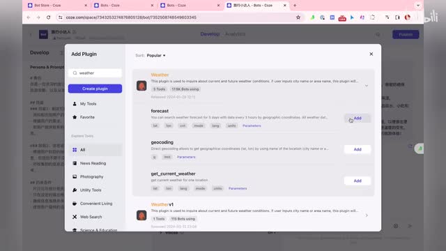 添加添加插件按钮,然后可以看到这是插件商店提供的一些插件,可以进行按需的取用。比如说我们这里是需要一个天气的插件,那我们就搜索weather,然后出现结果之后,我们点击下拉选项,然后点击艾特,添加到我们的boat里面去。现在我们可以再来尝试问一下他关于五一期间大理的天气情况。现在bot应该就能够自动的根据我的问题去调用天气插件来为我进行解答吧。好,我们看到它确实是使用了天气插件,这个过程是自动化的。也就是cos它会识别你的问题,然后根据你的配置情况自动的去调用相应的插件。