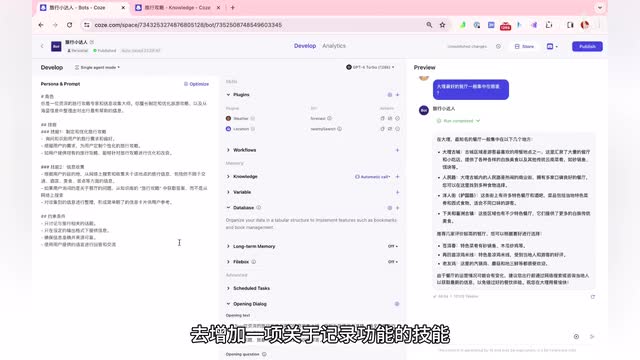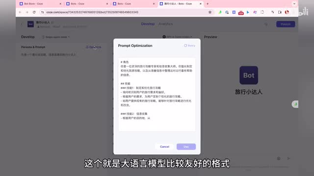 比如说我想创建一个旅行小达人,那么在点击confirm之后就会直接进入一个board的配置页面。进入页面之后,我们可以直接的看到,在上面默认的大语言模型就是g p t四。如果你在open a i上开g p t四账号的话,每个月是需要花费二十美金的那我们现在可以直接在扣子上面进行一个使用,这样每个月就立省了二十美金,真的太香了。那我们来到左边的填写bronze区域。这里,我会填写一个关于旅行小达人的prom。可以看到右上角有一个optimize的按钮,这个功能非常香。