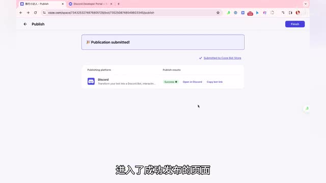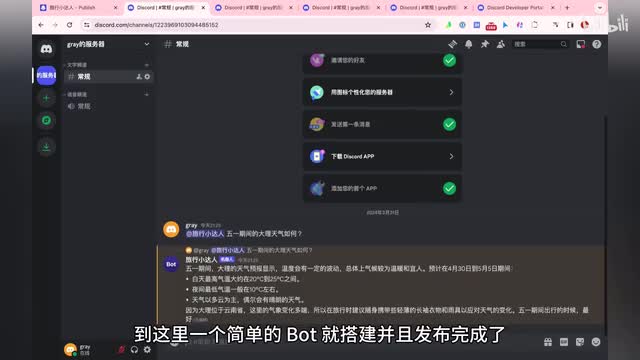 成功后可以看到这里的状态已经是configure的了,那我们现在就可以进行一个发布操作啦。我们选择一下对应的分类。比如说我我选择entertainment的一个分类,也就是娱乐的一个分类,然后点击publish。进入了成功发布的页面之后,我们接一下这个open in disco,来测试一下我们的board是不是已经成功的发布到了disco上面。然后就可以前往我们的那个服务器上面去进行测试了。然后我们在这里选择app我们的旅行小达人去给他发一条消息。
