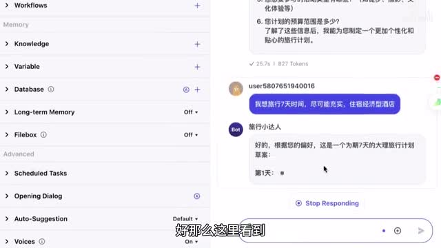 然后我们开始进行提问,比如说我告诉他,我想五一去大理旅行。让他给我提供一份旅行的计划。哎,bot开开始回答了,并且问了一些关于旅行编号的问题,那么我也进行一个相应的回复。好,那么这里看到bot已经给我们回复了一版简单的计划。然后我问一下他大理的气候如何?需要准备什么衣服?那如果说我们想真正的了解出行对应日期的天气状况的话,其实我们还需要额外的能力。比如说我们可以看一下这里的markets。