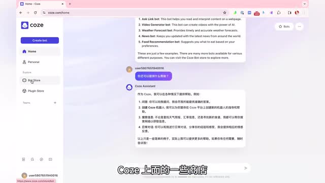 那么登录之后可以看到,一进来看到的是一个和cos assistant,也就是cos的一个小助手进行对话的一个聊天面板。你可以在这里去问他一些关于如何使用cos的问题。接下来我们也可以开始自由的探索一下扣子上面的一些商店。比如说board商店,在这里你可以找到其他用户发布的很多主题,不同分类的board或者是bargains。bargains的话也就是当你自己创建board的时候,可以引用的一些别人的插件来丰富你的t的能力。那么我们现在就来直接创建一个自己的bot吧。