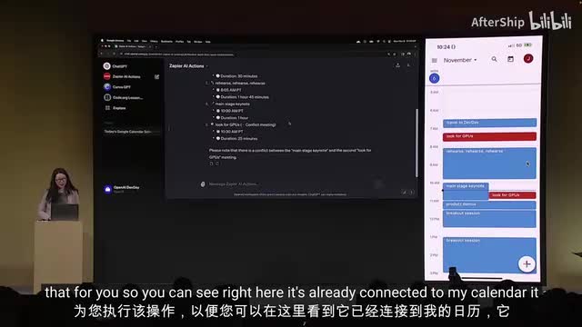 重点我们来看一下最后的一个ensor。然后我这里给放大家放一个open a i发布会的一个演示吧,就方便大家看一下这些材料,然后可以看一些a i action。and on the right hand side, you can see that's my calendar for today. so it's quite a day. ever to use this before. so it's actually already connected to my calendar. to start, i can ask. what's on my schedule today? we build g, p, t with security in mind. so before it performs any action or share data, it will ask for your permission. so right here, i'm going to say aloud. so g, p, t is designed to take in your instructions, make the decision on which capability to call, to perform that action, and then execute that for you. so you can see right here, it's already connected to my calendar. it pulls in in my information. and then i've also prompted it to identify conflicts on my calendar. so you can see right here, it actually was able to identify that. so it looks like i have something coming up. so what if i want to let sam know that i have to leave early? so right here i say, let's sam, no, i gotta go chasing g. p. s. so with that, i'm going to swap to my conversation with sam. and then i'm going to say, yes, please run that. sam, did you get that? i did. awesome. 这个action其实是可以让我们有一些调用的能力去调用其他的一些a p p。