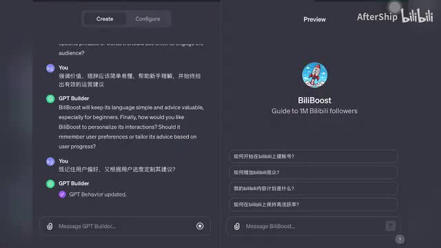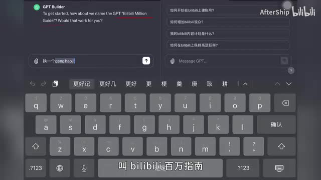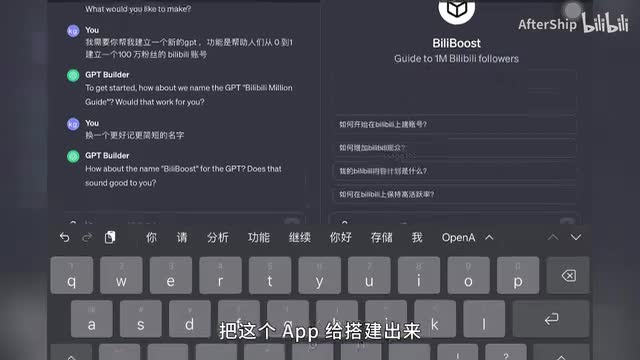 然后他会问你,他可以帮你做一个g p t,可以给他一些指令。啊,我举个例子啊,我就会让他去新建一个新的g p t,然后这个g p t的一个功能是帮助人们从零到一的搭建一个一百万粉丝的必哩哔哩账号。ok完成。
