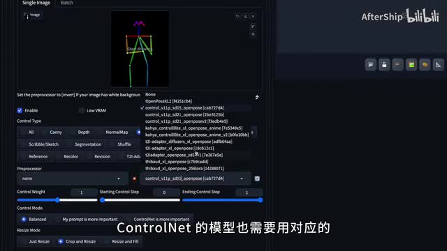 那这个时候我们就要选择这里的control type为open post。预处理器这里我选择维纳。然后因为我们的模型是使用的s d x l,所以这里control net的模型也需要用对应的x l的模型。好,我们再把刚刚的提示词再给复制上来一下。