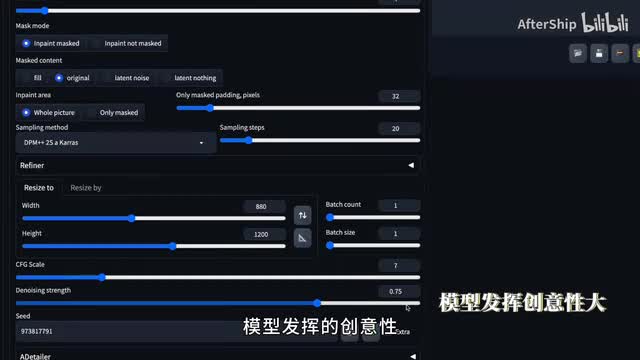 接下来可能重点需要讲一下这个参数,这个参数的作用就是说我的重绘幅度大概是怎么样的。如果这个值越接近于一,那其实就是说模型发挥的创意性会更大。也就是说我最后生成出来的图片会更随机。但如果说这个值我调的会比较小的话,那就说明我到时候模型生成出来的时候是更需要参考这一张人脸。