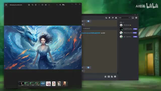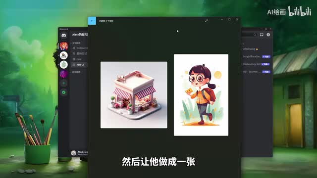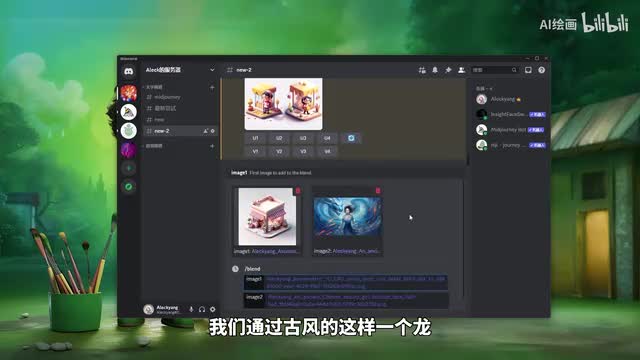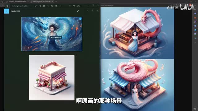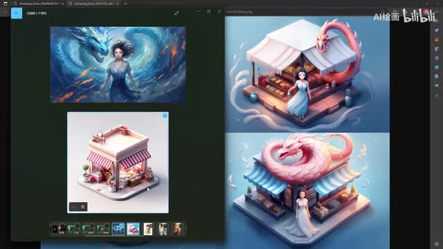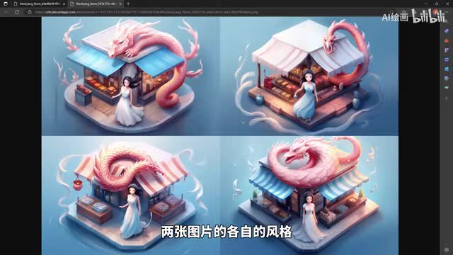 我们本来就是本来是一个一个商店的二点五d的一个插画表现来画的。然后呢,我们另外一个张图呢,就是我们一个古风的那种呃原画的那种场景,然后一个龙与少女的一个场景。那么呢我们通过这个融合之后呢,得到的结果是什么样子的呢?大家看一下。我们是变成了一个。