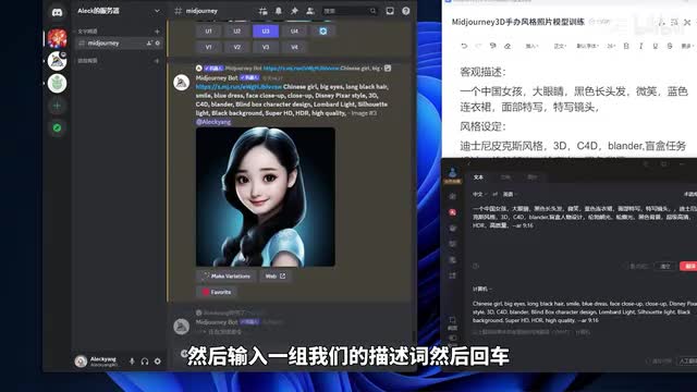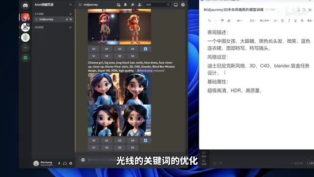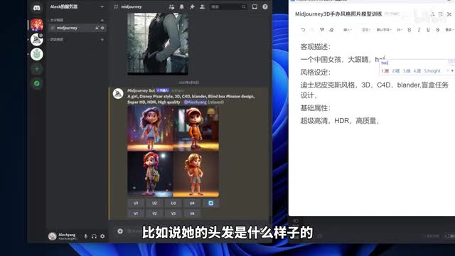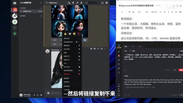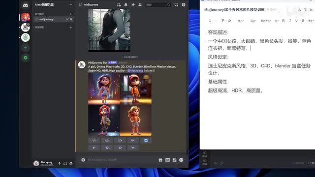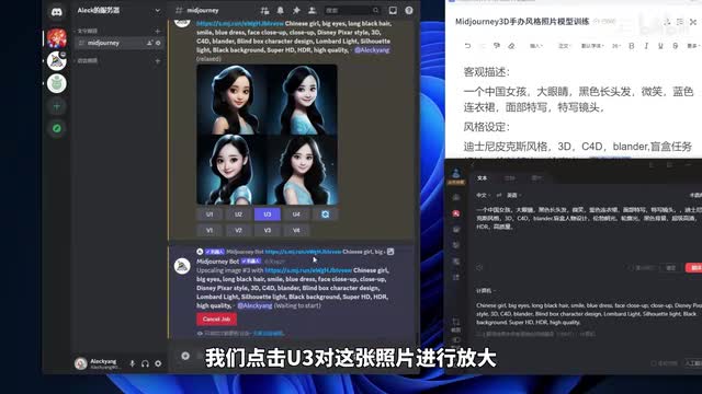然后呢,右键复制链接,在输入框输入斜杠,选中emerging,在prompt中粘贴刚刚这张图片的地址。空格,然后输入一组我们的描述词,然后回车。这个时候我们等待几秒钟,就会有四张风格相近的图片呢有md建立机型发出来,我们只需要选中我们喜欢的进行放大。那么呢我们的三d手办风格的图片呢就会出来了,非常的快速。