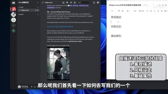 我们的描述词呢它有三个组成部分。第一个部分呢是客观描述,第二部分呢是风格设定,第三部分是基础的属性。那么呢我们首先看一下如何去写我们的一个客观描述的画面。这个画面呢是需要一个人物,一个女孩,对吧?那么呢我们先把第一部分的基本描述里面写上一个女孩,先写到这里。