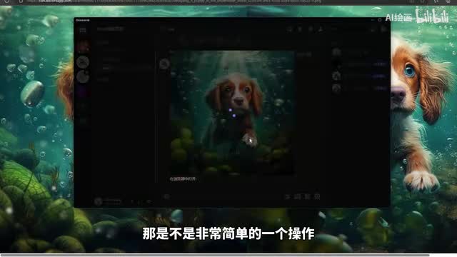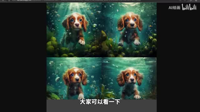 那么我们可以看一下这个呢他通过这段描述词呢给我们生成了四张在海底世界的小狗。那么我觉得这张口这张这张图呢比较符合我的预期,对吧?那么我可以可以去选这张图。那么我们可以看一下。我们怎么去选择它呢?我们就要用到下面这一排的这两排的一个操作。