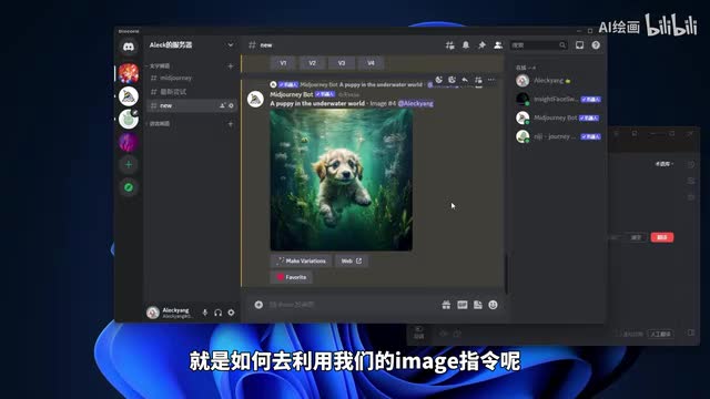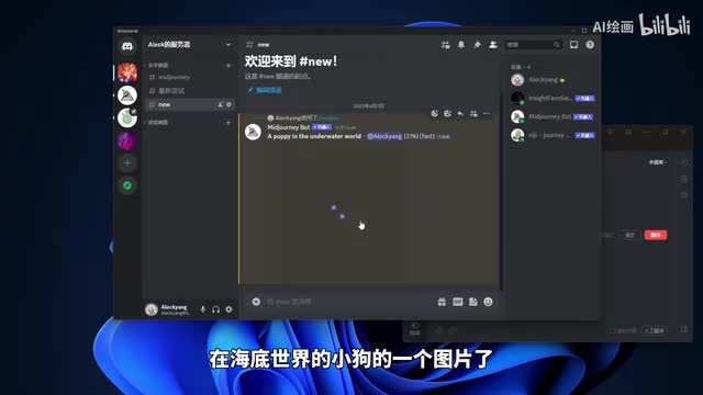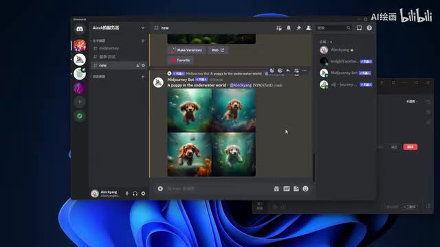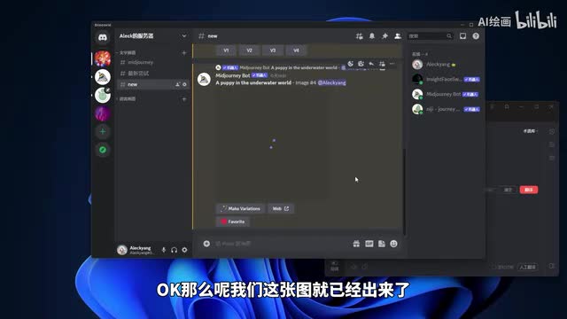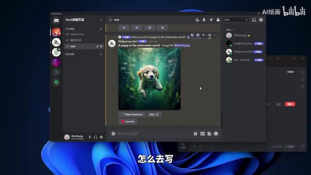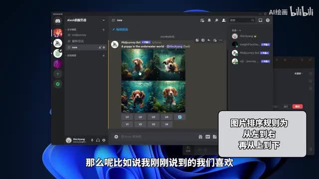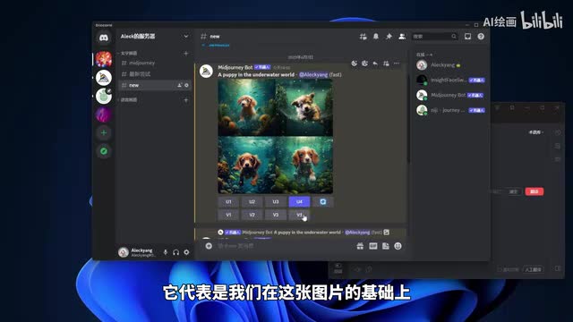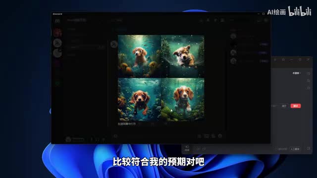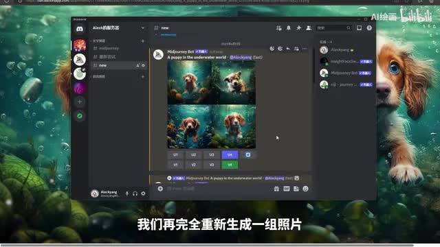 o k这时候可以看一下我们的画面中出现了我们的聊天窗口,出现了这种四张模糊的图片。这个时候呢呃我们mate mate经理机器人呢就已经在开始给我们生成这张在海底世界的小狗的一个图片了。我们看一下,稍等片刻。ok那么呢我们的生成已经完成。