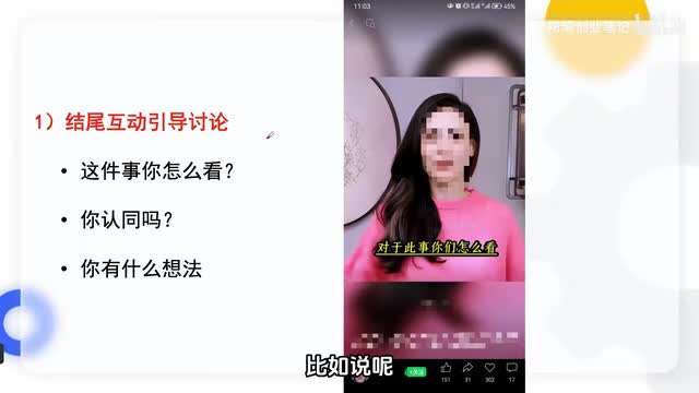 接下来呢我们来聊一下如何提升创作分成计划的收益效果。这里啊给到大家两点建议。第一点呢我们可以在结尾互动区啊去引导大家讨论。比如说呢我们可以在结尾去留下一些悬念,这件事情你怎么看?你认同吗?或者是你有什么想法,从而呢引发用户到评论里面去讨论。