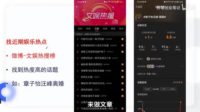 娱乐类的呢通常来说我们可以去做一些明星的八卦,明星成名之前的一个故事解说,或者呢是做一些明星的感情纠纷。同时啊我们可以去找到一些近期的娱乐热点来做文章。那直接可以打开微博的文娱热搜榜,去找到近期的热度高的一个话题。比如说前阵子啊章子怡和汪峰离婚的这个事件,如果能够把握住啊拿来做视频,那它的播放量是非常可观的。