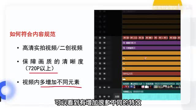 那一定要确保画质的清晰度啊,建议大家清晰度啊保持在七百二十p以上。并且呢如果我们是做二创的,建议啊在视频里面去增加一些不同元素。比如说呢这个就是我们自己二创下来的一个视频啊,可以看到有增加很多不同的特效,不同的贴纸,来让这个视频的原创度更高一点。那如果说呢你不知道自己的视频啊是否符合内容规范,你可以呢去通过视频的一个加热评估一下你这个内容啊是不是属于优质内容。