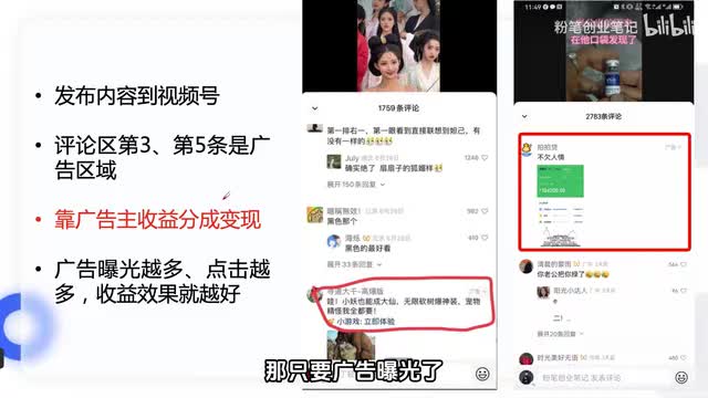 简单来说呢就是我们呢作为创作者把视频发布到视频号上。发布之后呢评论区的第三条或者是第五条呢就会出现广告。那只要广告曝光了,或者是广告被点击了,我们就能够赚取到分成。那也就是可以理解为我们的播放量越高,我们能够拿到的广告分成就越高了。