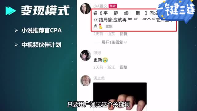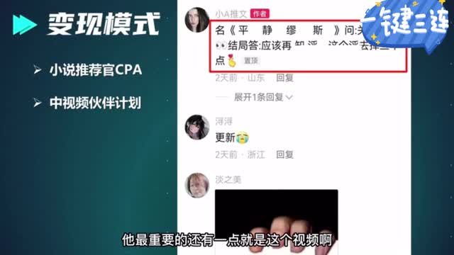 只要有人通过他这个视频去搜这个小说的完整版,那么它每位小说平台推荐一位读者啊,他就能够拿到十块左右的佣金。这个效益啊可不次于中视频计划。如果大家去看一下这类视频的评论区的话,你会发现啊作者一般都会顶着一条让你去找这个小说完整版的一条评论玄机啊。