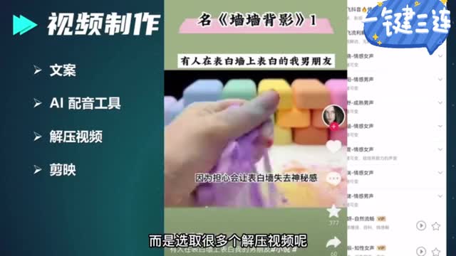这样的话呢,我们就有了一个配音的的音频文件了。接下来呢我们可以去找一些解压的视频,这样我一开开始给大家展示的那个视频一样,这个地方要注意一下这个解压视频啊,我不不要只用一个,然后选取一一个解压视频呢给它进行重新的,然后直接以一个配音的呢,它它这样然后呢一个一个的视频了,这样的话呢,这个视频就完成了。这样的视频它的生产速度是非常快的,然后呢,一个视频十分钟以内就能搞定,然后呢,我们大家一一张。