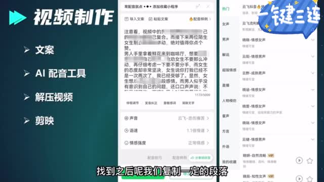 制作了。其实视频的制作啊非常简单,因为它压根不需要你写文案,文文案就直接用小说里边比较经典的,这样能能够引起大家好奇心的这些段落。这样的话呢我们复制一个视频呢,大概一千个字左右,然后呢可以去到一个个的配音工具里边,然后我一一一个个看上去还比较舒服的主播视频了,然后就可以直接到配音文件了。