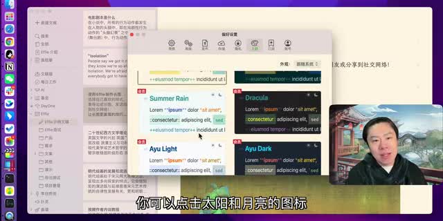 而且呢艾菲还加强了图片导出的功能,你可以非常方便的把一篇文章导出成长图传给朋友或者发在社交平台。有些图片样式我觉得还是挺好看的啊。而且呢现在f也支持选择主题。大家可以看到我今天演示的界面是一个黄色的界面啊,不是之前那个原生的白色。那今天呢我选了这个solvers light这个主题,呃,你可以点击太阳和月亮的图标,在浅色和深色模式下使用两套不同的主题。那如果你选这个,你的界面会根据系统来切换的话,那这两个主题也会切换。那未来呢f a会继续丰富我们的导出图片和主题里面配色的样式。如果你是一个设计师,有好的创意也可以和我们联系,我们可以把它做到f c里面去。呃,f c呢还有一个重要的更新就是f a i。