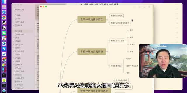 就是你可以用提取大纲的功能,就是你可以把随便一篇文章轻松的做成这个大纲或者思维导图。当然呢你也可以反向操作,就是用思维导图来生成一篇文章。甚至呢这个思维导图本身也可以让a i来凭空给它生生成出来。f a i呢有一个头脑风暴的功能,这个功能生成出来呢其实就是一个导图啊,我前面有个视频给大家下载的话,我们可以现在在f a试一下。我们可以打开这个思维导图,如果你去哪里需要补充呢?我们可以手动补充,也可以让a i来进行补充。就是不光是a i生成大纲可以扩充啊,你自己写的也可以,任何一张大纲或者思维导图,你都可以让f a i来扩充它的内容。f a i呢会根据整篇大纲的上下文,试图先理解这个大纲的逻辑,然后再给你做一些拓展。呃,我们前面说f a i支持你同时问多个问题,同样呢在思维导图里面也支持同时拓展多个节点。比如说这里呢我希望把这个现代生活的起源拓展一下,然后呢想让他多讲讲宙斯,也希望a i多给我讲几个故事,对吧?这样他可以同时做这几件事情啊,这样的在你缺乏思路的时候啊,你就可以很简单的让a i给你一些参考,你用不用再说对吧?如果你觉得a i它思路不好,它拓展的不好,你就不接受嘛,你就点这个叉号就可以了啊,如果你接受呢,你就点这个对号。