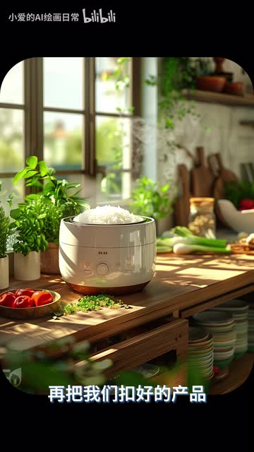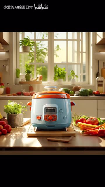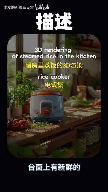 厨房里蒸饭的三d渲染电饭煲台面上有新鲜的蔬菜和食材,阳光透过窗户撒进来,温馨氛围。