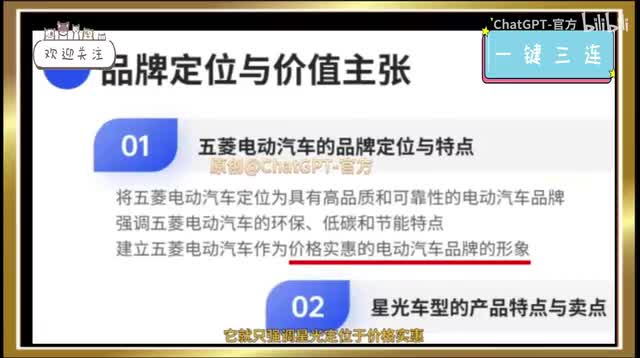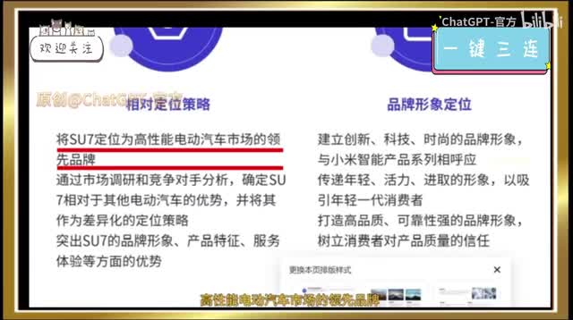 我分别让他制作了小米电动汽车苏七和五菱电动汽车星光的营销策划p p t。在小米酥七的策划里,他就提到了要将苏七定位为高性能电动汽车市场的领先品牌,建立创新、科技、时尚的品牌形象,与小米智能产品系列相呼应,他这是真的了解了小米酥七这个品牌策略,李总看了也会点赞。