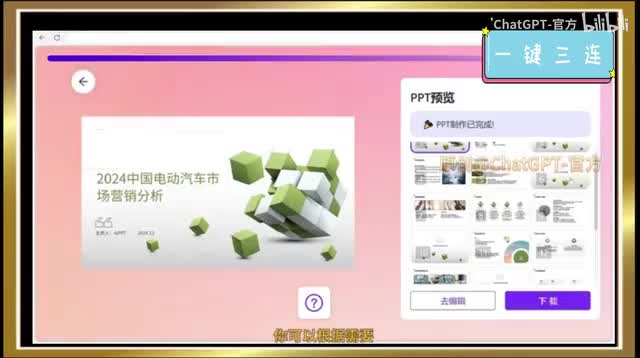 选择好后,点击这里即可生成p p t生成速度非常快,品质和时间比是人工的几十倍。你可以根据需要对生成的p p t进行形式和内容上的微调编辑,然后导出为p p t文件,一个p p t的制作就完成了。