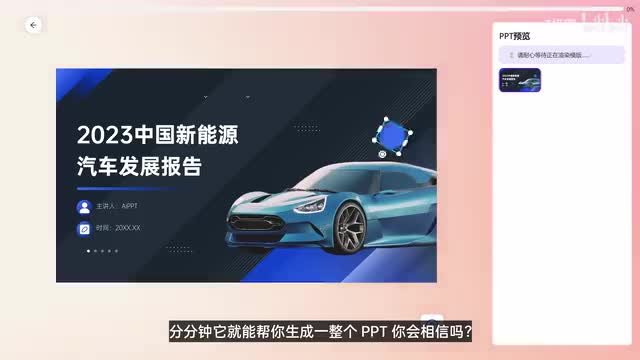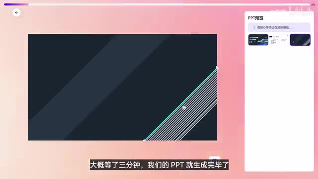 选好以后单击生成p p t之后,它就会自动完成做p p t的过程了。大概等了三分钟,我们的p p t就生成完毕了。接下来我们可以进入到编辑界面,修改我们的p p t。