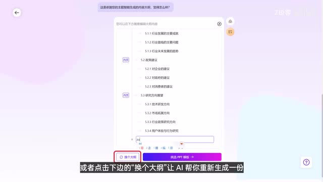 比如说我让它生成一篇二零二三年中国新能源汽车发展报告的p p t,可以看到它立刻就将内容大纲生成出来了。如果对生成的大纲内容不满意的话,你也可以在这里直接修改生成好的大纲,或者点击下面的换个大缸,让ai帮你重新生成一份大纲,也可以用思维导图的模式显示,生成的导图也可以保存到本地。如果不需要用a i生成的大纲的话,你也可以直接上传你已经写好了大纲文件,让他帮你生成。