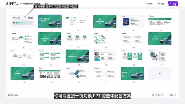在大缸内进行的所有编辑也都会同步到p p t中。在下面可以切换视图,当你切换到网格视图之后,你可以直接一键切换p p t的整体配色方案。在下方p p t的预览界面单击选择一个子页,你可以在这里直接切换页面的排版样式。
