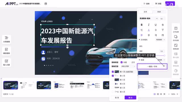 p p t中所有的元素都可以修改。你可以在右侧更改p p t的字体形状和背景颜色,在修改字体的地方,你可以直接替换掉整个页面的字体。你也可以单击左侧的大纲编辑,直接在大纲里面同步对p p t进行修改。
