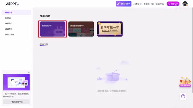 这个a i p p t你可以在网页上在线使用它,大家可以点击评论区里的置顶链接来体验。我们单击智能生成p p t之后,就进入到了智能助理的对话界面。这里我们就直接给他一个主题。
